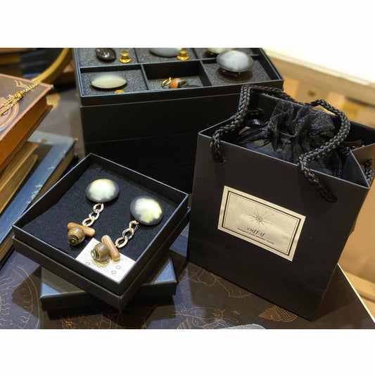 「月光を浴びた水の底をうごめく光」をイメージに、独学で作り出した「空想石」をメインにした装身具の製作を始めたことが活動のきっかけ。