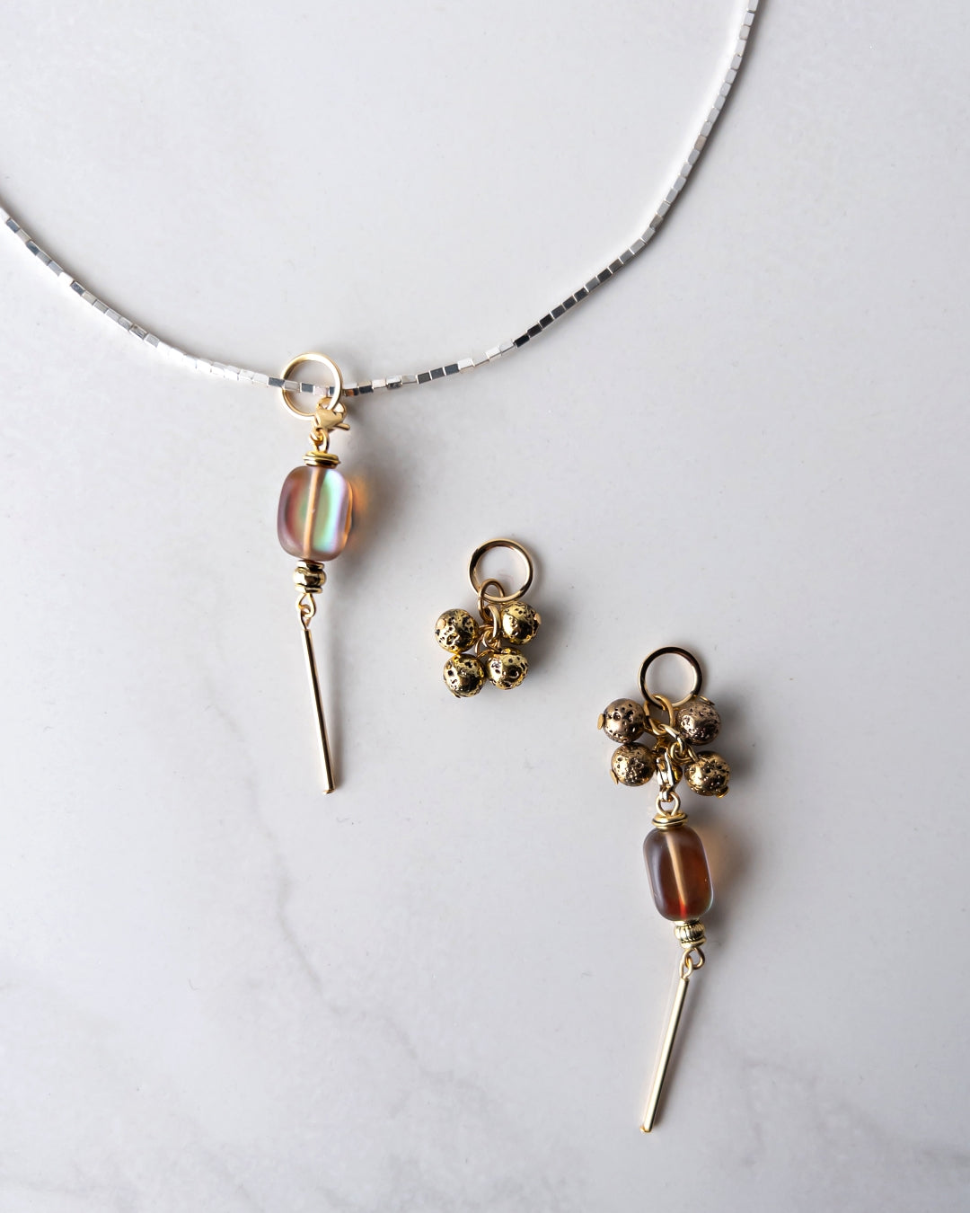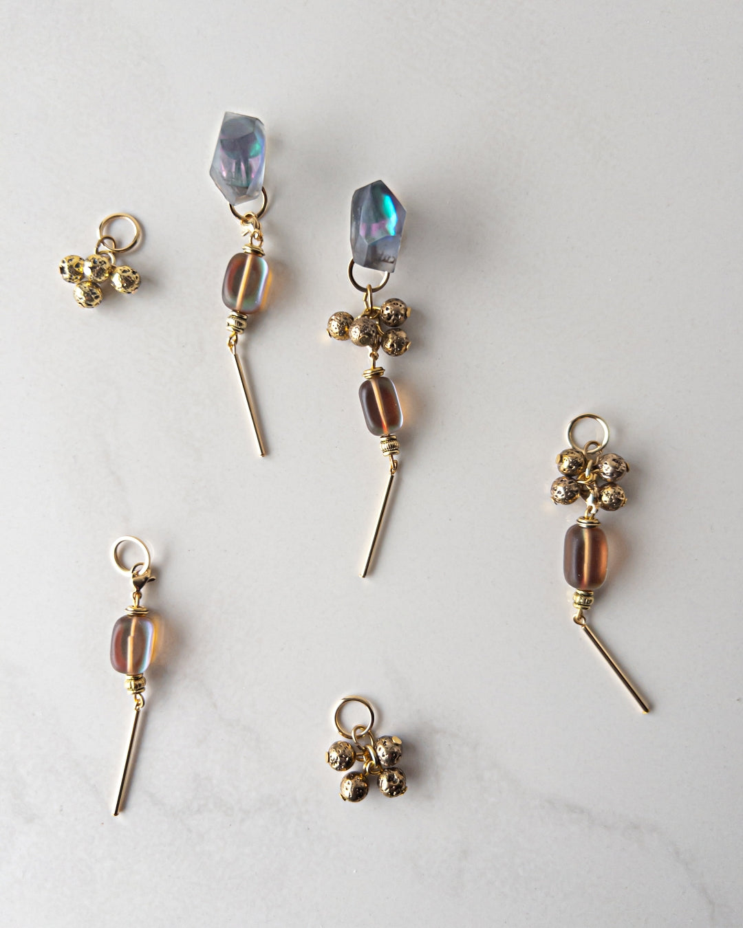 イヤリングやピアスポストに引っ掛けるだけで違うアイテムへ変化するチャームたち。