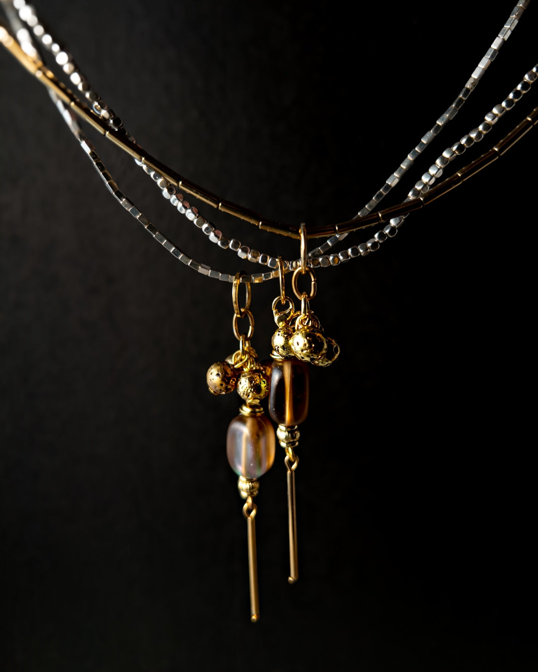 素材:304ステンレス(通し金具)、ラヴァストーン/ゴールドコーティング(天然石)、ブラウンルナフラッシュ(人工石)、メタル、チベットビーズ