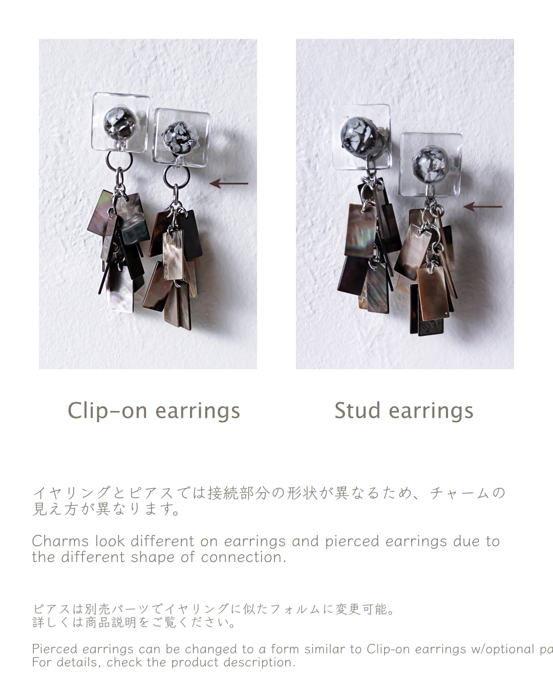 ※接続部分の形状の違いのため、チャーム上部の見え方がイヤリングとピアスで異なります。サンプル画像は一点もの以外は全てイヤリングで製作しています。