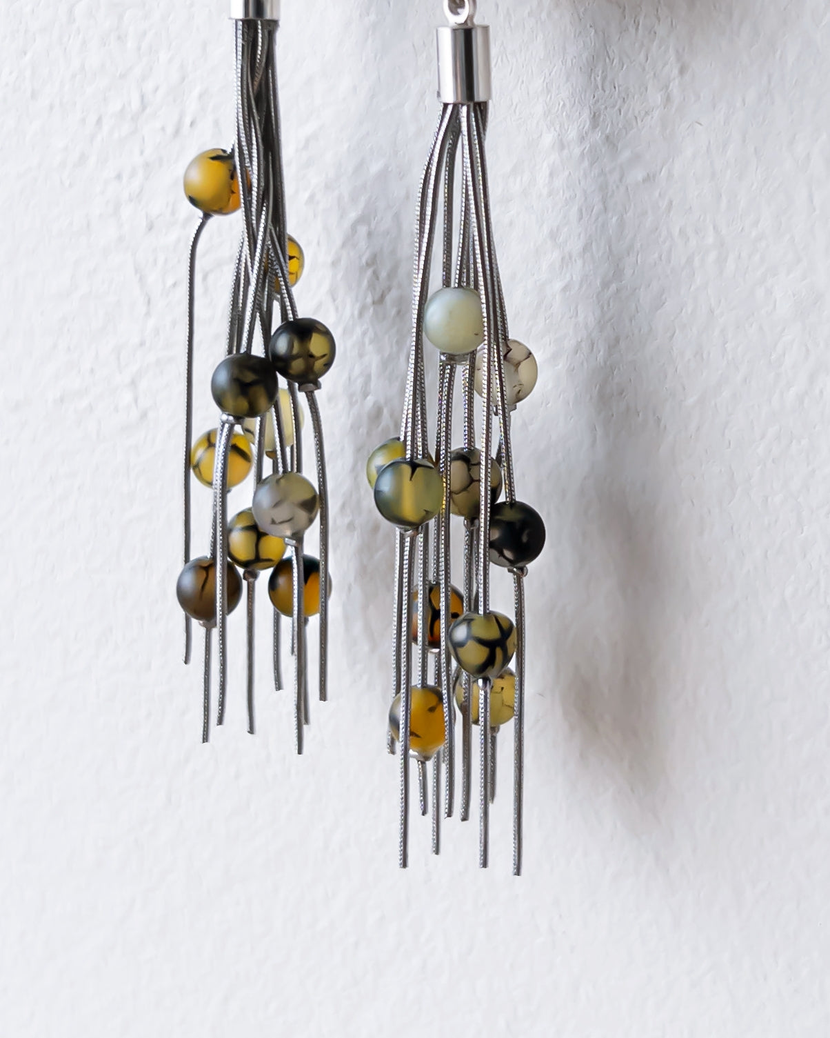 樹脂から全てハンドメイドで一粒ずつ製作しています。同じデザインでも色柄や気泡の入り方や風合い等が個体によって異なります。