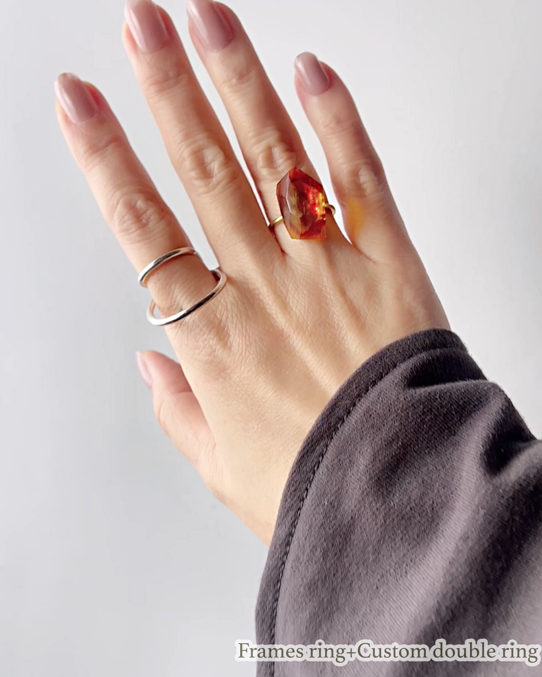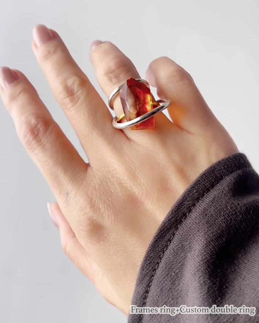 また、大きく浮く方のリングの空間に別売りリングを入れて着けると立体感が出て他にはないフォルムも楽しめます。