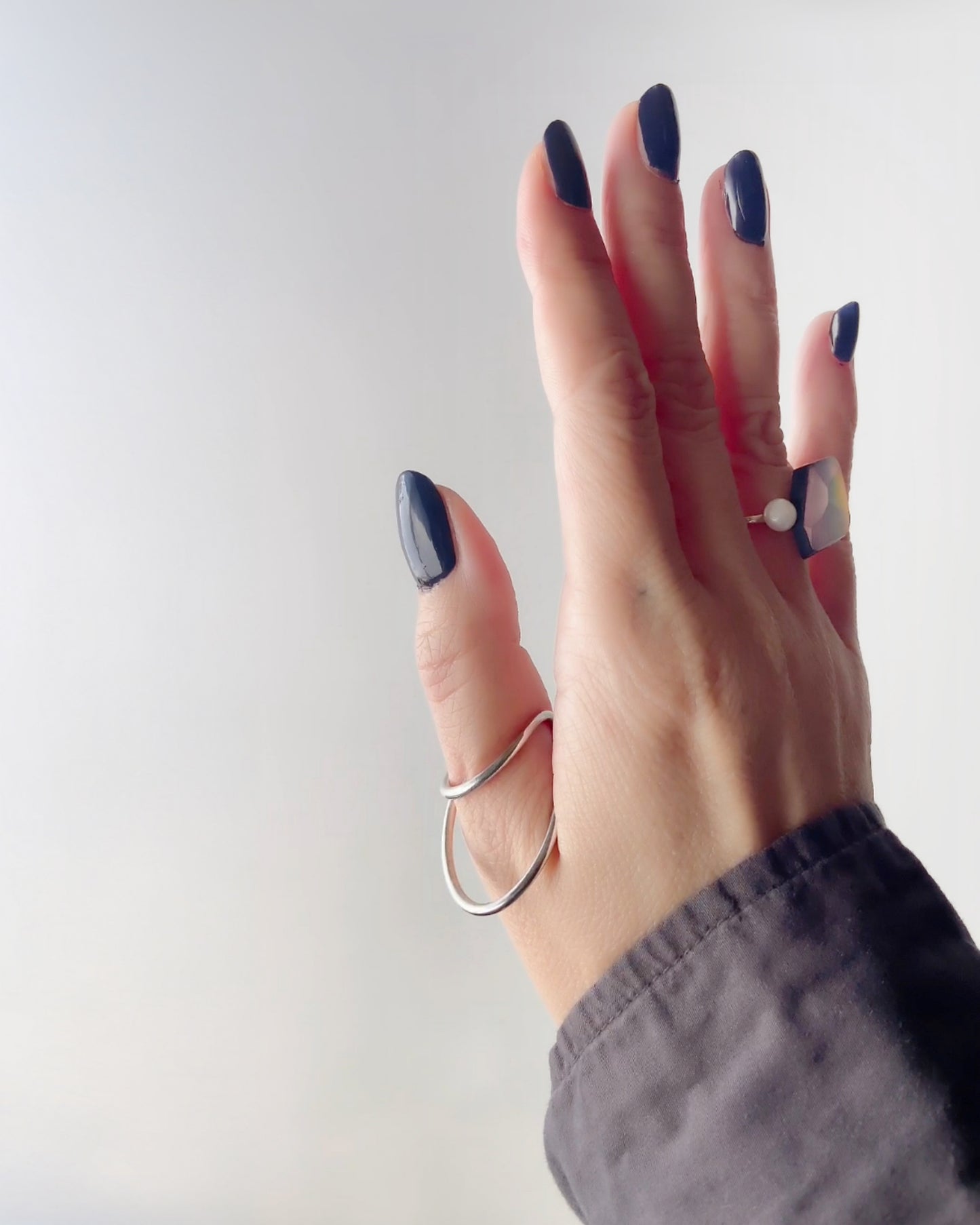 1つのリングは指に沿う形に、もう1つのリングは大きく指から浮いて空間を持たせた形です。リングの幅や角度、指と空間のラインの見え方を似合う形に調節して楽しめます。