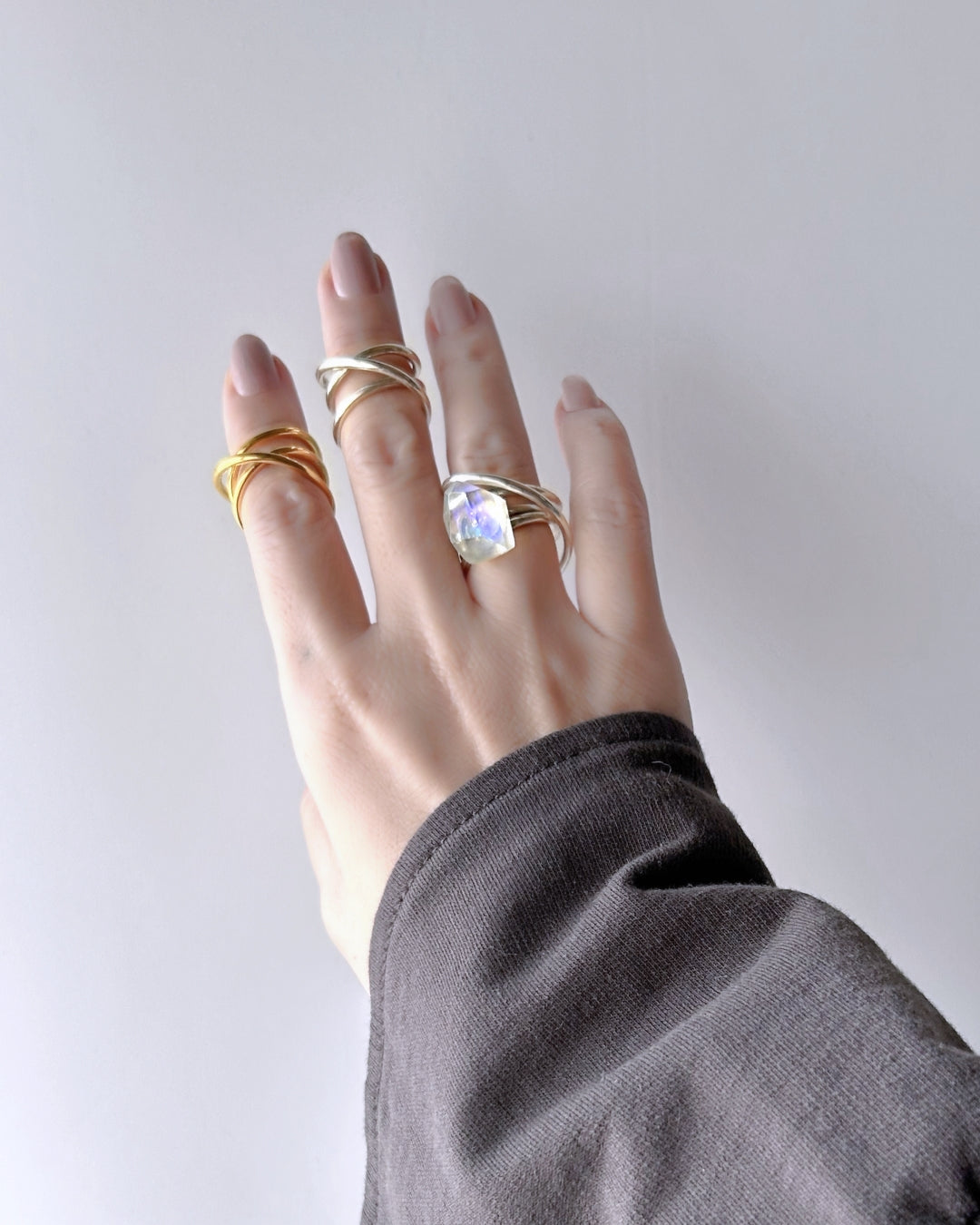 金具の色味が若干透過するので、ゴールドのリングは黄味がかって柔らかい色合いに、シルバーのリングはクールな色合いになります。