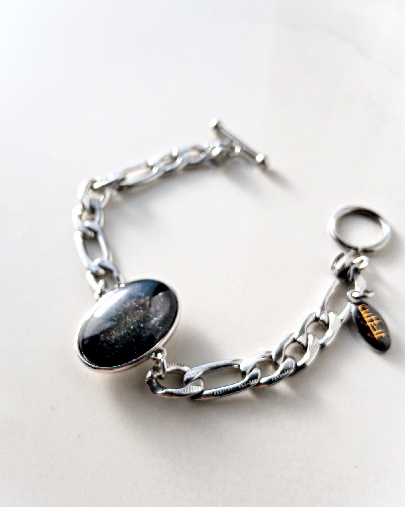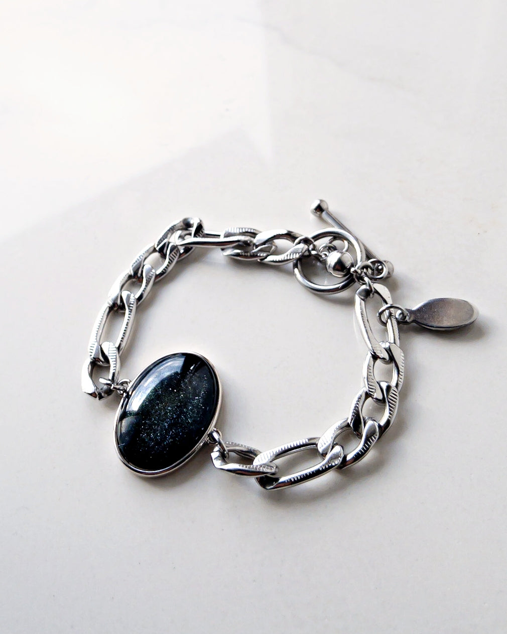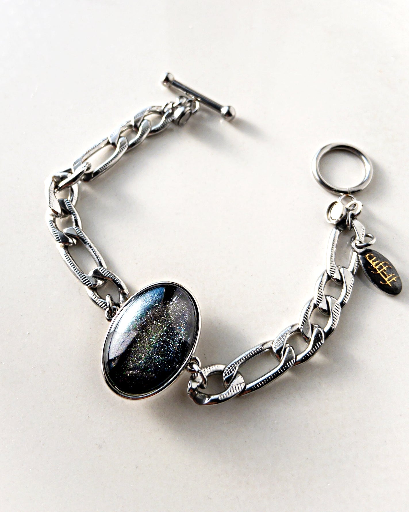Galaxyシリーズの空想石を合わせたブレスレット。オーバルの空想石は光の当たる角度で変更する青ベースの宇宙を覗き込んだような色合いです。
