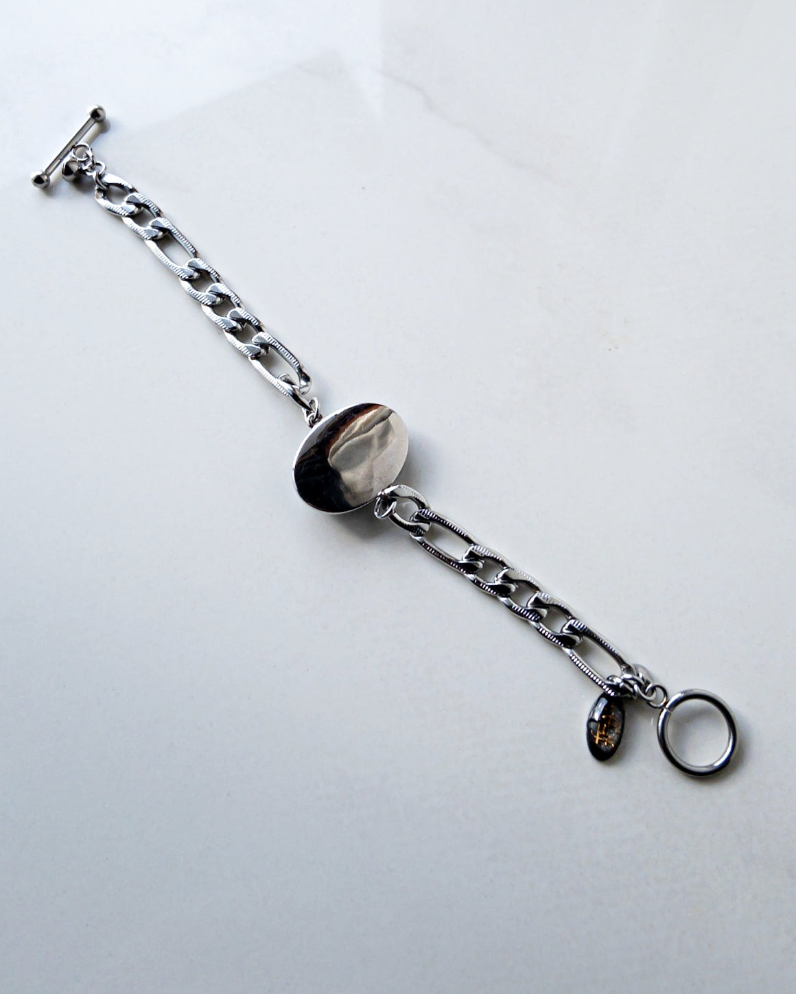 台座以外はオールステンレス製で金属アレルギーの方にも着けて頂きやすいブレスレットです。ツヤツヤのロジウムコーティング加工なので皿部分を表にしても着用可能です。